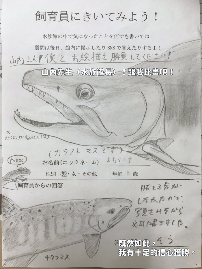 不只要高情商回覆,還要擁有神畫技!這天一位15歲的遊客向館長發出「畫魚挑戰」,遊客畫得魚不僅輪廓十分神似,一旁充當旁白的青蛙也活靈活現,但在水族館閱盡千魚的館長也不是吃素的,寫下:「我有十足的信心獲勝。」就在紙上畫出五官、斑點、特徵鮮明的魚類,各位妞妞們覺得這場比賽的贏家是誰呢?
