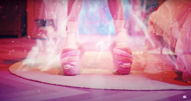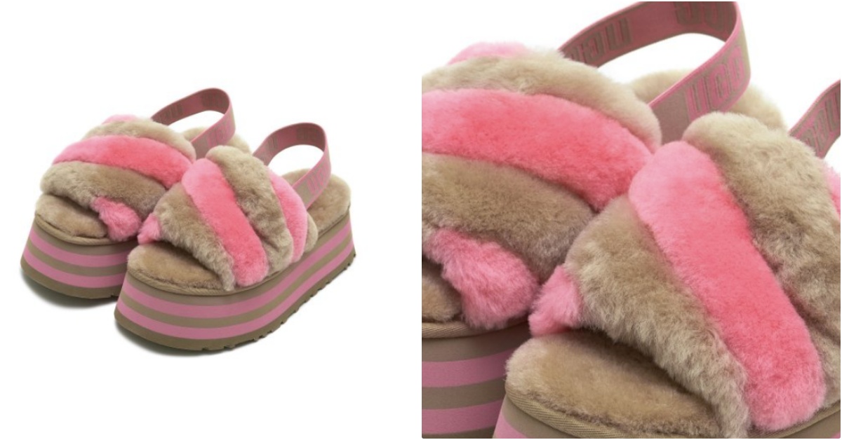 MV中當IU在草莓月亮的魔法中(?)飛上天時,腳上這雙可在室內穿、也能時髦上街的「毛絨涼鞋」,粉嫩草莓粉加上溫柔奶茶色混搭,還搭配超厚鞋底,可愛度爆表的款式來自於美國品牌UGG的出品,他們家的毛絨系列紅好幾季了!