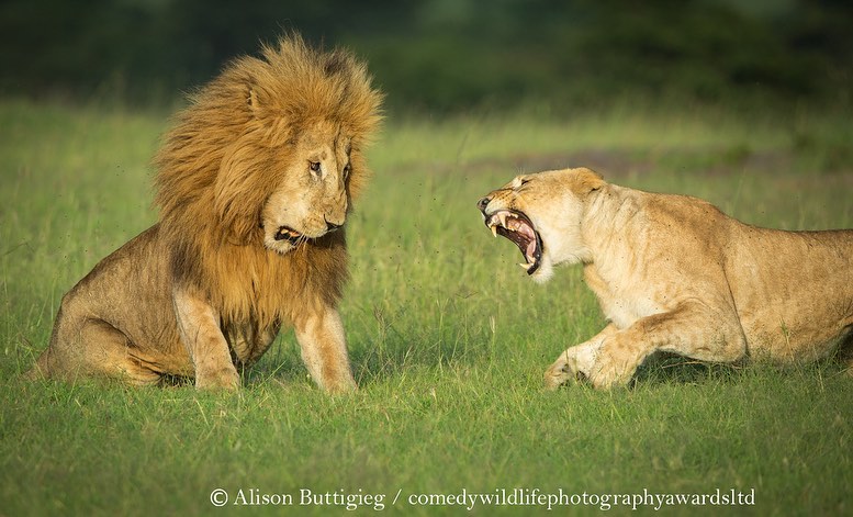 草原版家庭劇真實上演「河東獅吼」的八點檔情景,公獅一臉「啊唷!我的媽呀~」的驚恐模樣,從表情中可見牠絕對是一位「怕老婆代表」了,網友也紛紛表示:「這場景好熟悉,我家也天天上演呢!」想要捕捉到動物生活中「糗樣」的瞬間,攝影師最辛苦的應該是拍攝同時還要忍住不能大笑吧!(太難了⋯⋯)