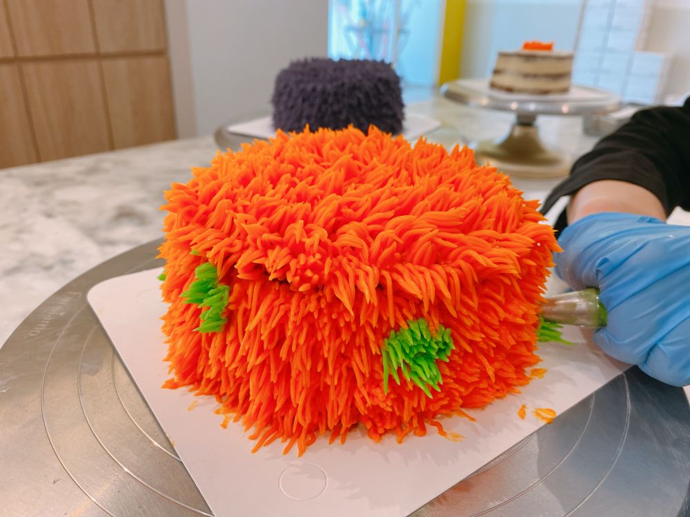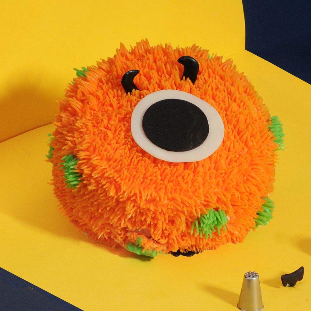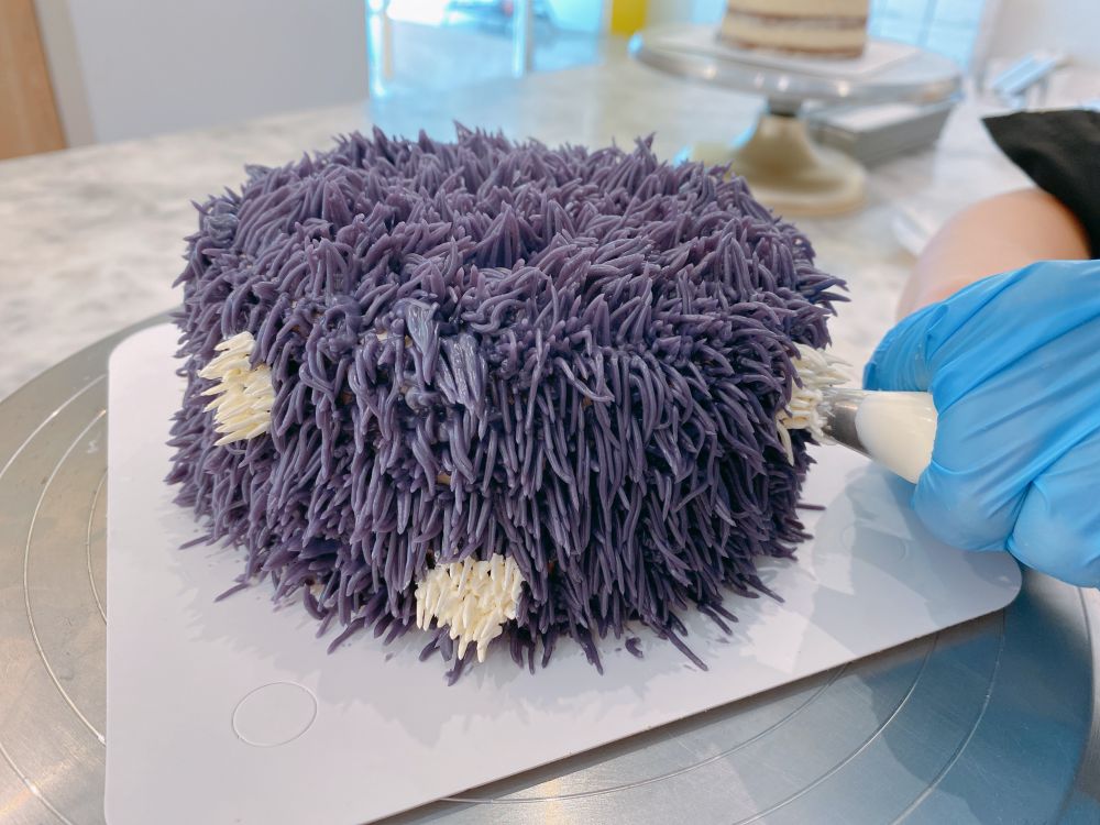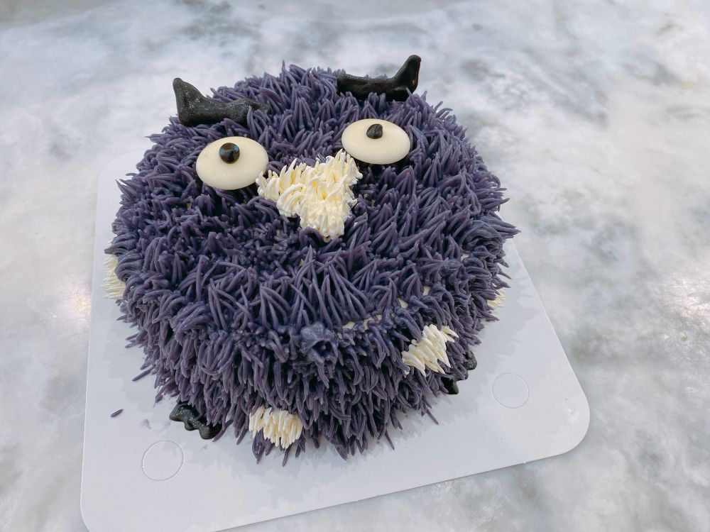 新登場的絨毛蛋糕「大睛&小怪」以小精靈為造型,「大睛」款是可可風味的戚風蛋糕,夾層加入了香蕉切片與香草奶凍,外觀擠上橘色、綠色的韓式奶油奶霜,最後放上以巧克力製成的小腳丫、大眼睛與觸角就完成啦~難度在於為蛋糕穿上「毛髮」的部分,擠糖霜時需要「垂直地擠」,相當考驗耐心與手巧程度。