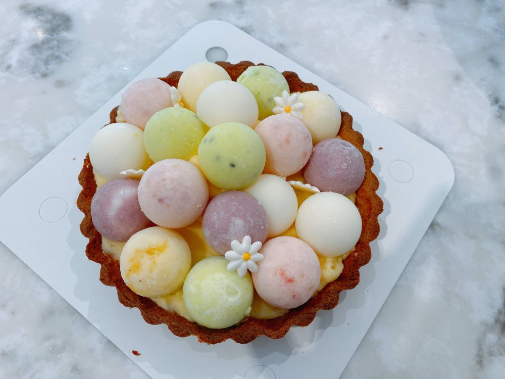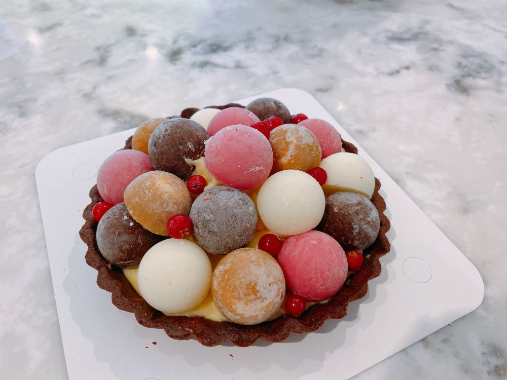 黛比波波也是卡士達塔派,不過底層的塔皮是巧克力口味,塔上的優格波波球以可可粉、咖啡粉與覆盆莓果泥調味,並用紅醋栗妝點,整體色調走成熟風格。(p.s.每顆波波球都加了麻糬,冰冰的口感中帶著Q彈嚼勁)黛比波波&翠絲波波的難度在為波波球脱膜的過程,把它們從模具扳出來需要一點力氣,但撐過這段就能得到夢幻的塔派囉!