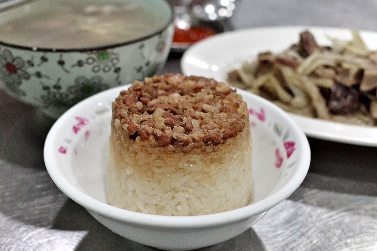 「東市羊肉」即使開在喧喧攘攘的市街上,仍然憑藉著傳承50餘年的好味道而在當地人心中屹立不搖。其中妞編輯最推薦這每日手工限量的「羊肉米糕」(一天僅約180顆左右),使用米糕湯蒸煮,剛出爐的米糕可以看見蒸氣翻騰直冒而上,老闆迅速地將米糕倒入碗內,由下而上些許湯汁、糯米、羊滷肉層層堆疊,整體嚐起來鹹香Q彈不會過於軟爛,單吃也很夠味!(喜歡重口味的妞妞們也可以酌量倒入甜辣醬或醬油膏哦!)