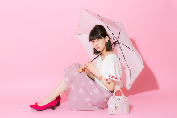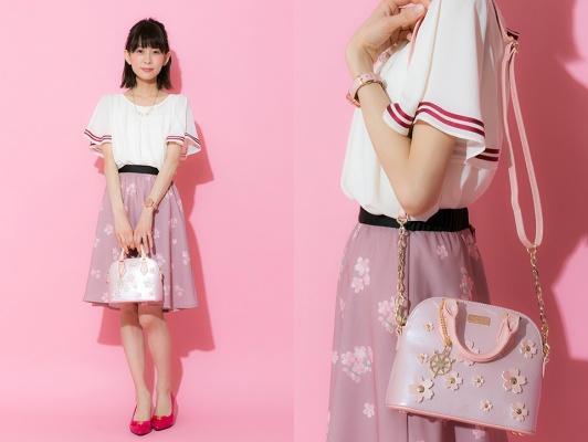 Pink Blooming系列走的是粉嫩嫩的少女路線,上衣的紅色滾邊可以看見小櫻的制服元素,裙子則是佈滿了櫻花的圖案,藕粉色氣質滿點~紅色的跟鞋讓整個人鮮明了起來,仔細看的話會發現蝴蝶結中間是夢之杖呢!