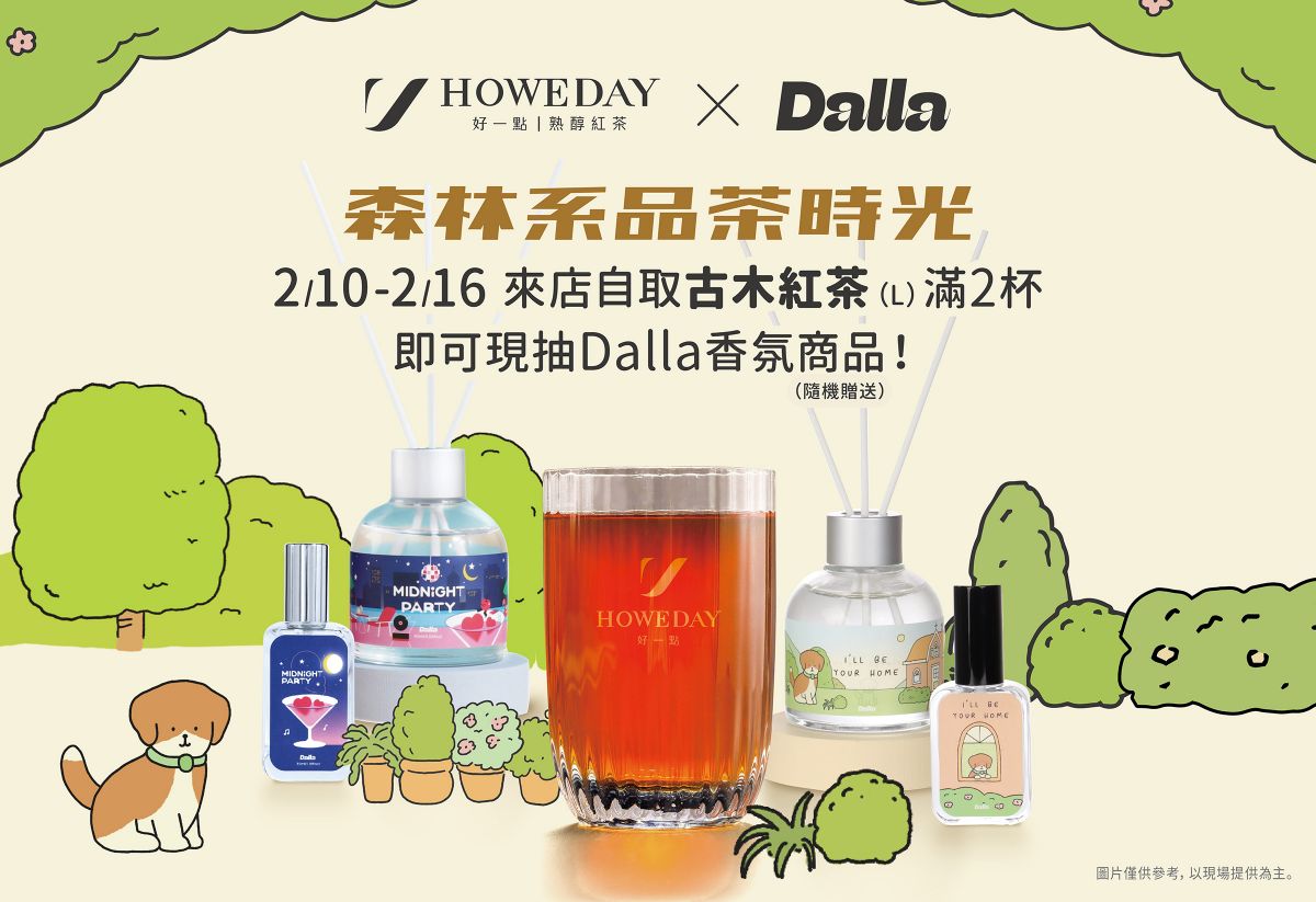 2月10日至2月16日,好一點熟醇紅茶與定位為「台灣最可愛的香氛品牌」Dalla合作推出「森林系品茶時光」抽獎活動,來店自取消費古木紅茶滿2杯,即可現抽Dalla香氛商品!有機會獲得木質調的「愛之歸屬 Safe Haven」及「午夜派對 Midnight Party」兩種香味的室內香氛瓶與淡香水喔。