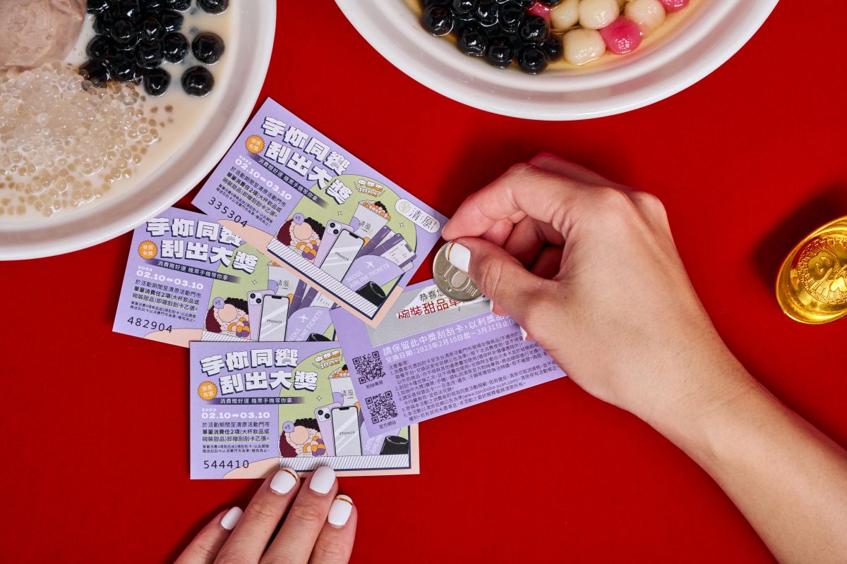 2月10日起至3月10日清原芋圓更推出「芋你同饗」刮刮樂活動,單筆消費任兩杯大杯飲品或甜品,就有機會抽中首爾來回機票、iPhone 14及大杯飲品、碗裝甜品的免費加料券和8折券等,趕快相揪好姐妹一起喝起來!(限門市訂購、電話自取、店家外送)