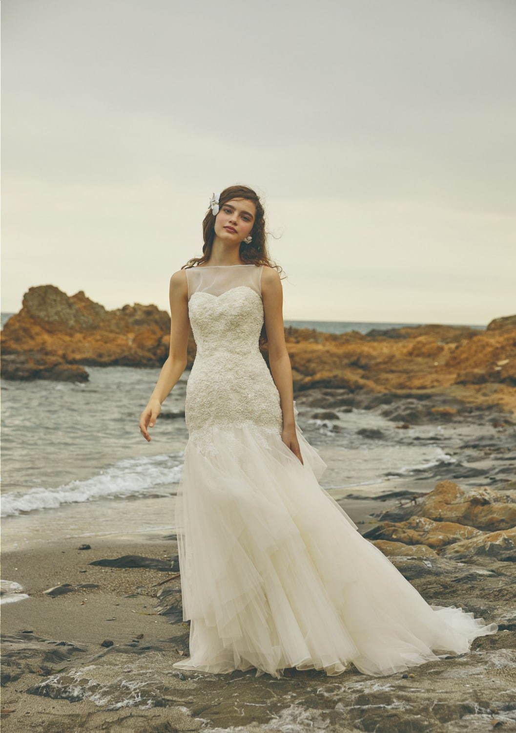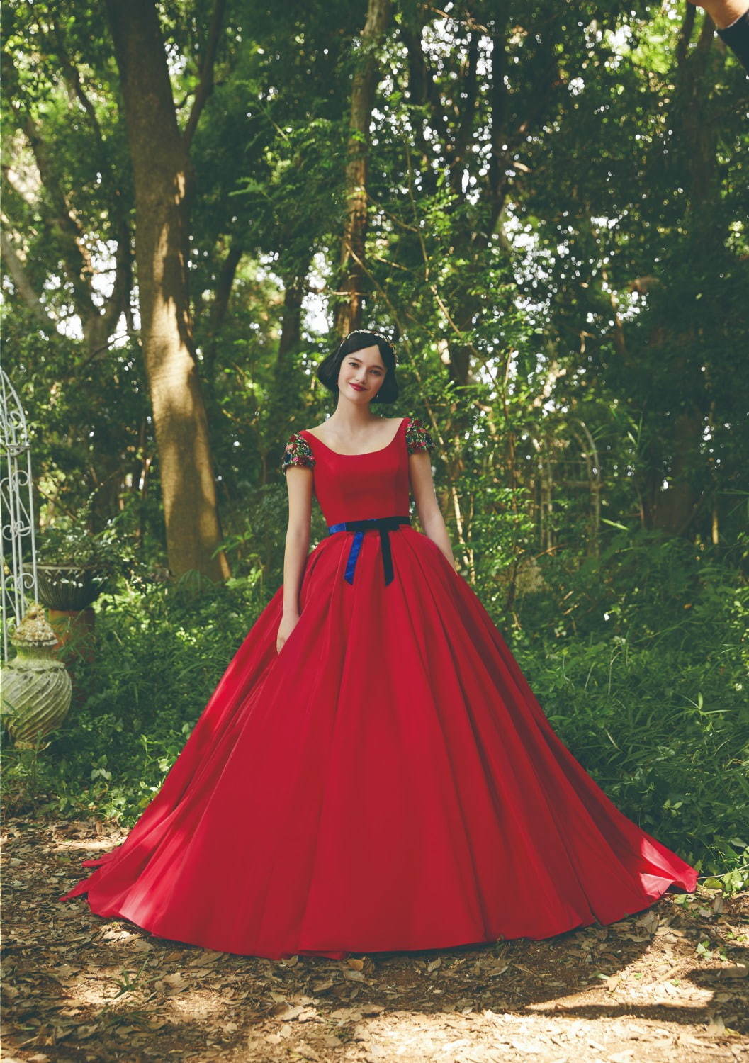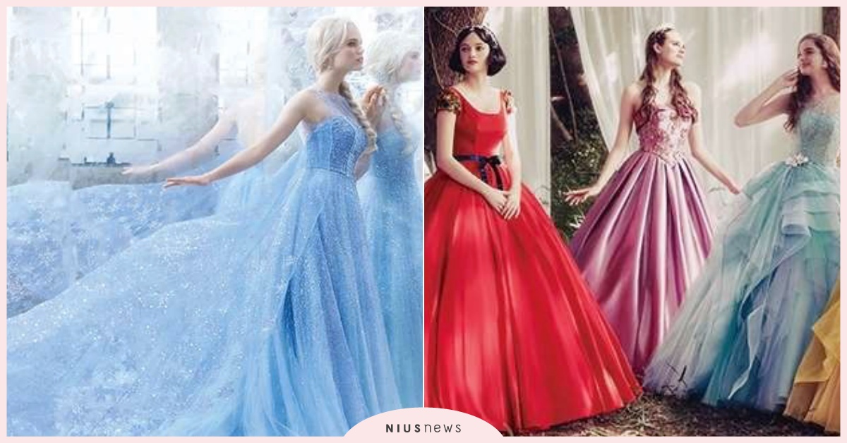 像是以白雪公主的「毒蘋果」為發想,打造的全紅蝴蝶結禮服,白紗款式則是鑲滿精緻蕾絲的澎澎袖復古設計,而仙杜瑞拉的白紗版本大走古典宮廷風,另一款則是變身瞬間的淡藍色澎袖造型,仙氣爆棚讓人想立刻說我願意!人魚公主「愛麗兒」以一席漸層紫藍色的澎裙亮相,根本就像把湛藍大海穿在身上,上半身更綴以散發隱隱光芒的海底珍珠,白紗款式則採用近年大勢魚尾裙,馬上擄獲專屬你的王子。
