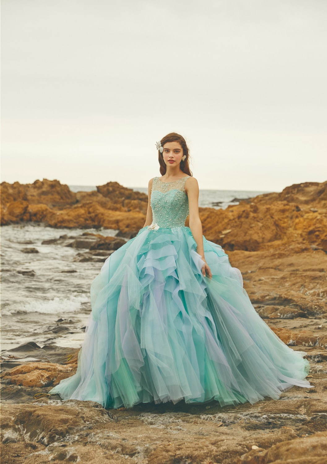 最新系列的這一件「艾莎雪花嫁衣」真的太犯規!立刻獲選最無可抵擋的禮服第一名,以《冰雪奇緣2》中艾莎的招牌水藍色為主色系,就像把冰雪魔法結成獨一無二的「冰之女王禮服」,裙擺上鑲滿施華洛世奇水鑽,每一個步伐都閃耀迷人光芒,而背面的斗篷感設計不只氣勢十足,仔細一看…居然印上了閃閃發亮的雪花,不論哪個角度都美到窒息。