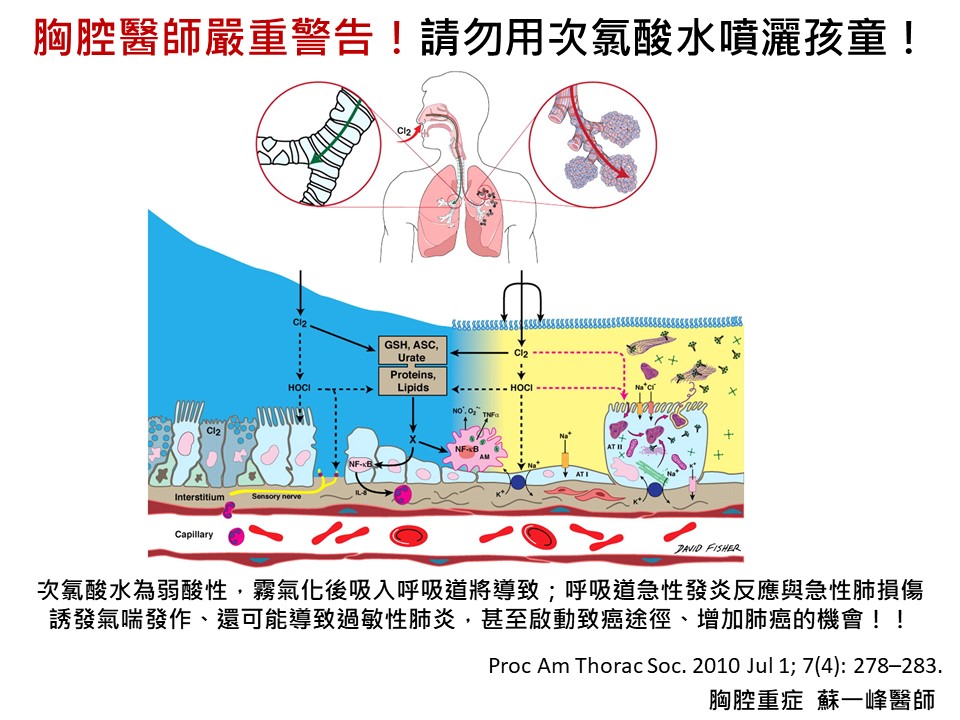 蘇醫師更補充,霧化(瀰漫空氣中)的次氯酸水進入呼吸道後會刺激呼吸道上皮(呼吸道中佈滿的分泌型細胞與纖毛細胞)產生發炎反應,增加氧化壓力*引起一連串的發炎反應!(*體內自由基過多,體內抗氧化物質不足以平衡,就會造成細胞受損,稱之為氧化壓力)