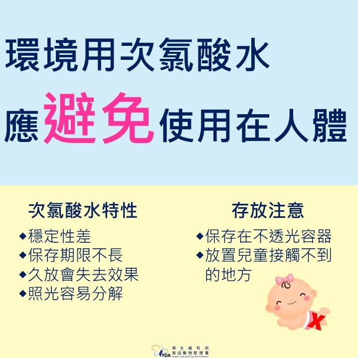 次氯酸水是一種消毒溶劑(不是漂白水),要避免使用在人體上,臺北市政府衛生局表示次氯酸水是弱酸性氧化劑,用於環境消毒;皮膚科邱品齊醫師更表示,如果商品上標明二級醫療器材證號,才能宣稱可以進行傷口及皮膚消毒,若只取得一級醫療器材證號,就只能用於器械消毒。