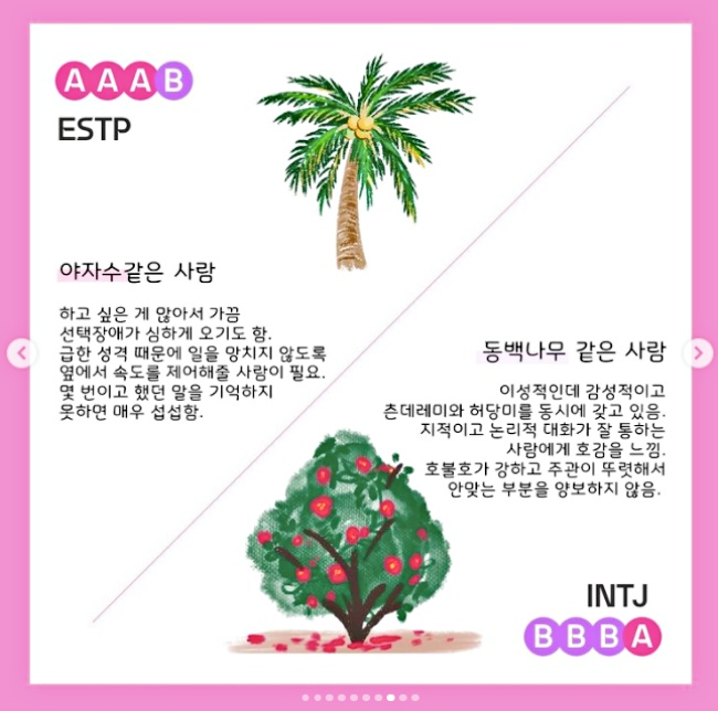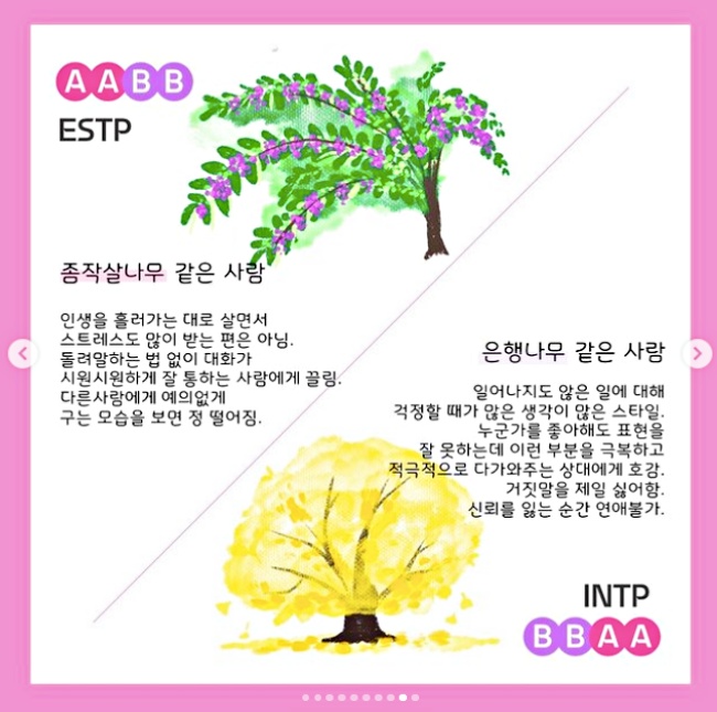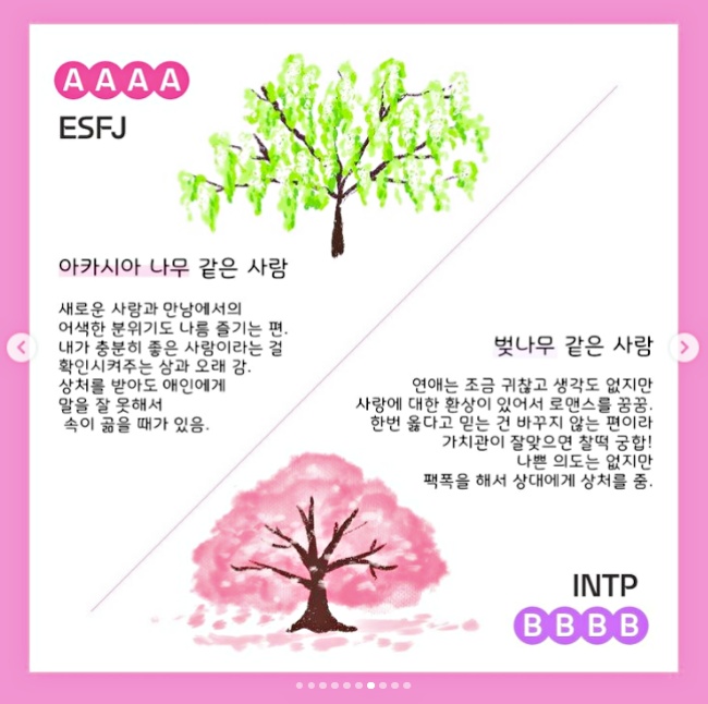 近日韓網出現可以測出「最真實的戀愛觀」的MBTI人格測試,同時用櫻花、椰子樹、銀杏樹等不同的樹木代表,回答以下問題把選擇A或B的數量記下來,就能測出最適合你的另一半特質!
