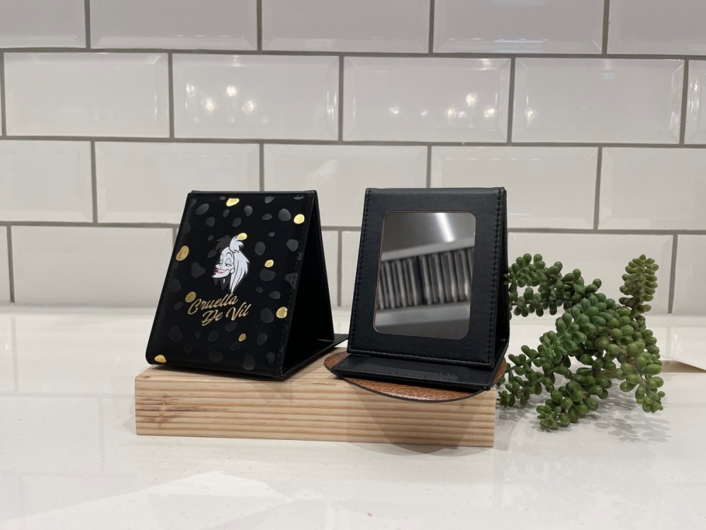 最後的聯名商品則是妞妞們每天都需要的「折疊鏡」,以庫伊拉為主角,上面有著金色和黑色的圓點互相交錯,別看它看起來好像很樸素,其實上面的圖案都是燙金造型,是摸得出來有凹凹凸凸的設計呦!重點是它還可以三段式調整角度,上課偷照鏡子也不會被發現啦!(喂!亂教)
