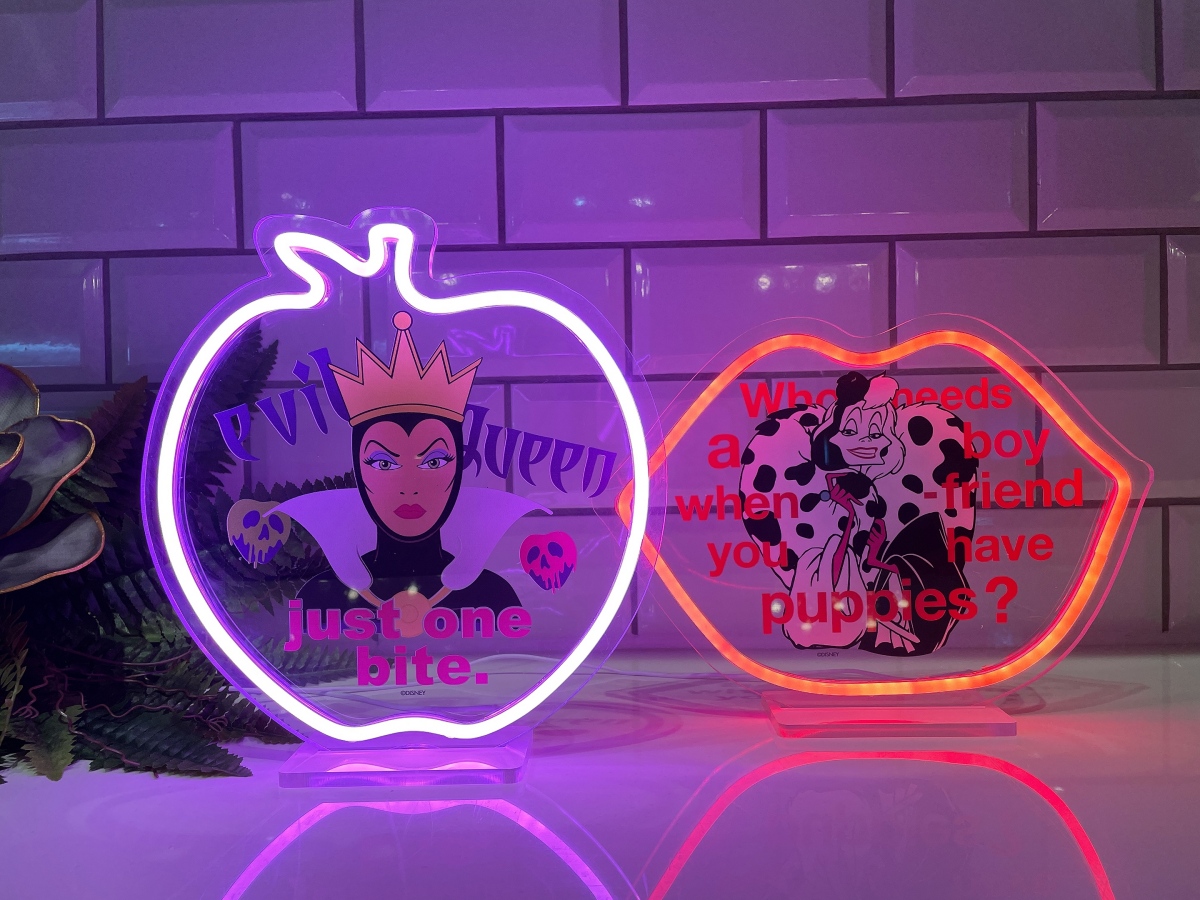 第一款要介紹的是本次聯名最特別的「霓虹燈」,總共推出壞皇后&庫伊拉兩款造型!而壞皇后是紫色燈條與毒蘋果相搭;庫伊拉則是紅色燈條與唇印相互映襯,讓妞妞們直接把夜店風帶回家!除了霓虹燈外,上面還有角色的經典名言,放在家簡直霸氣外露~(預購款6月5號到貨,且為原店取貨呦!)
