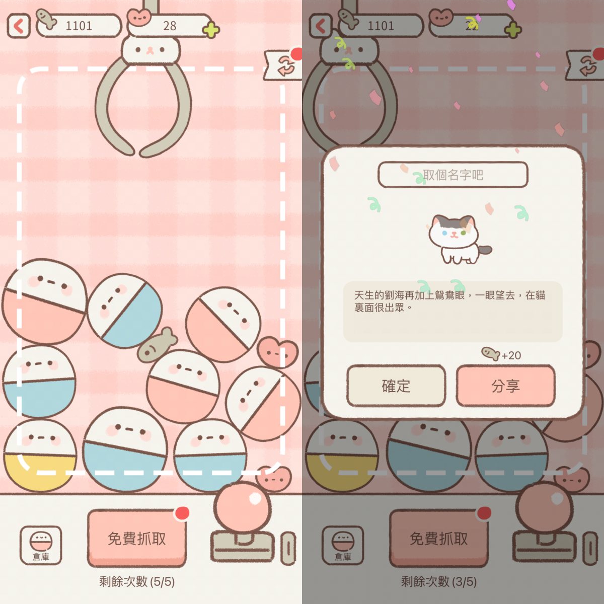 遊戲同時加入夾娃娃機元素,在「抓貓機」中,除了可見的小魚乾與愛心之外,每顆蛋中藏著小貓咪或傢俱,成功抓取就有可能得到牠(它)們,若想收編新的貓貓,就來這裡試試手氣吧!
