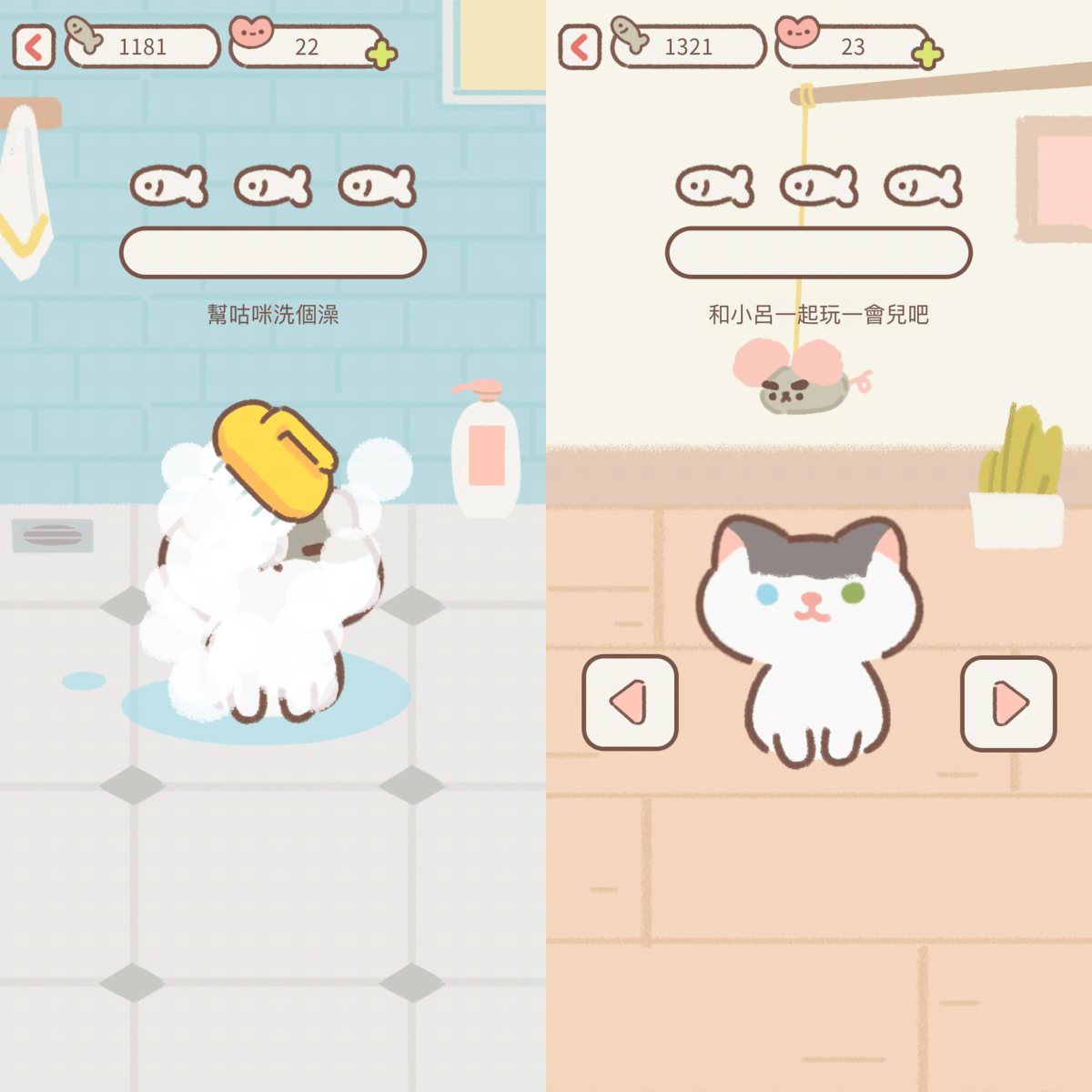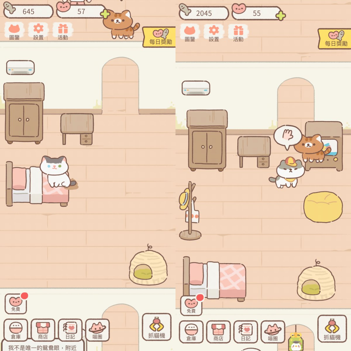 將房間裝飾得越豐富、越漂亮,就能看到主子更多萌樣(像是睡在床上、使用貓抓板)。另外,鏟屎官們也別忘了定時清掃環境,點按「便便」也能換魚乾哦!(貓貓解放的地方超多,桌子、床都是牠們的廁所⋯⋯)