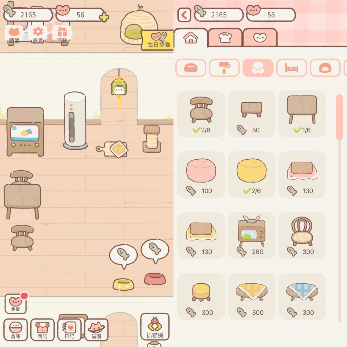 傢俱與貓咪用品可從「商店」中用小魚乾或是愛心購買,入手的傢俱會被收集在「倉庫」,長按即可拖曳至室內空間。你的家最初會有客廳,接著可解鎖房間、廚房、浴室、花園等區域。
