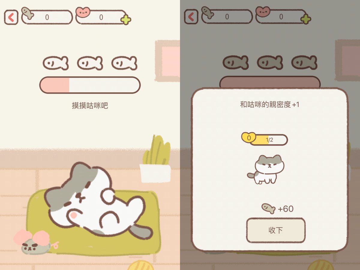 成功收編貓咪後,不僅要定時補充貓糧,還得滿足主子發出的需求(例如摸摸牠、幫洗澡、陪玩),只要逗貓貓開心,就能獲得小魚乾並增加親密度(愛心)。「小魚乾」與「愛心」是這個世界的貨幣,能用來購買傢俱與服飾,或解鎖「日記」劇情。(擼貓時開聲音,還能聽到「呼嚕呼嚕」喔!)