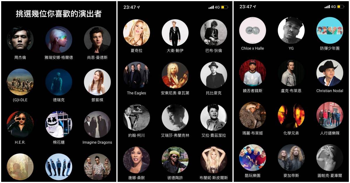 一開始進入《YouTube Music》時,首先需要挑選自己喜歡的演出者。歌手選項來自台、日、韓、歐美等地,選好後就能進入主頁囉!(如果沒有在這裡找到喜歡的歌手,別擔心,進到主頁後,可用搜尋功能將歌手加入播放清單)