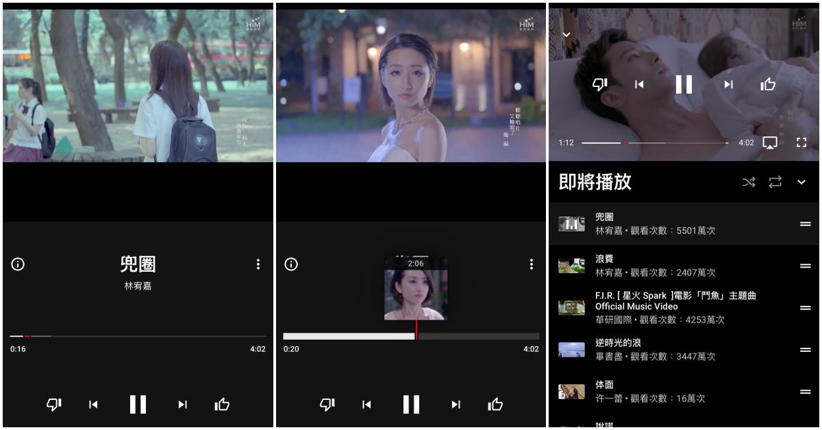 收聽(觀看)影片的實際畫面如圖,滑動時間軸可選擇影片片段,最下方有喜歡/不喜歡按鈕(點喜歡的話,App會自動將歌曲加入歌單)、暫停鍵與切換歌曲鍵。其實畫面跟YouTube挺類似的,不過可惜目前沒有歌詞欄,播歌時無法跟著一起唱QQ。