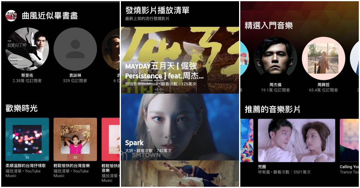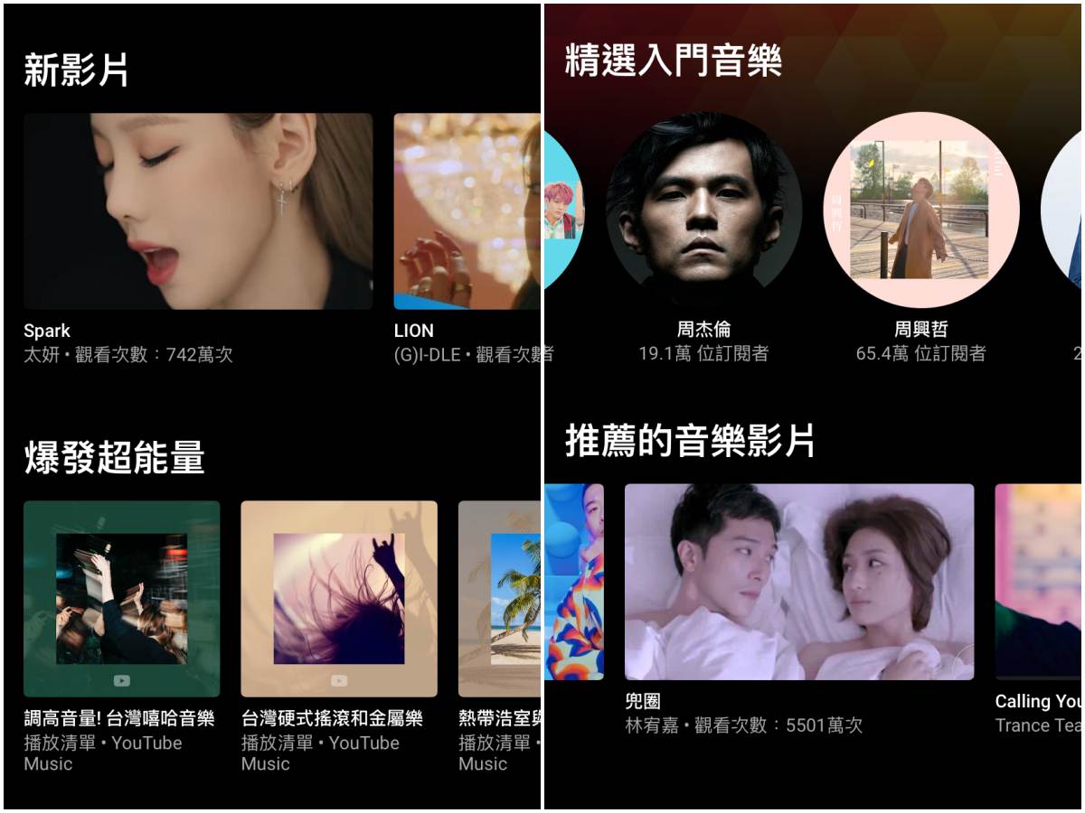 《YouTube Music》的主頁提供了最新YouTube音樂影片、精選入門音樂、風格歌單、熱門歌曲歌單等資訊,其中精選入門音樂收錄的歌手,就是最一開始我們選的演出者哦!當然,你也可以匯入原本的YouTube歌單。手機小姐個人覺得App的推薦功能非常聰明,除了會推薦「與使用者喜好演出者風格類似的歌手」之外,還會根據使用者聽過的音樂、所在的地點推薦適合的歌曲。