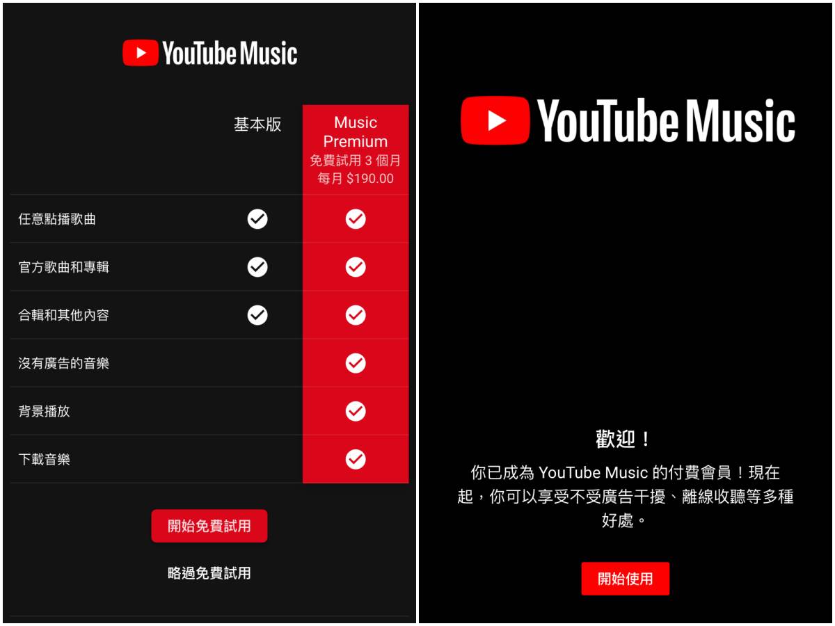 基本版跟Premium(付費版本)的差異就是Premium會員在聽音樂或看影片時,不會受到廣告侵擾,即使跳出App音樂也會持續播放,「鎖屏播放YouTube音樂」終於被實現,而且還可以下載音樂哦!付費訂閱服務部分,安卓用戶為149元,iOS用戶為190元。即日起至11月26日晚間11點59分訂閱個人方案,可免費試用3個月。YouTube Music除了手機版之外,也推出了網頁版,有興趣的妞妞敬請前往體驗囉!