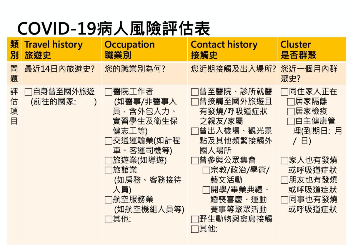 衛福部特別在全台各地設置「社區採檢院所」以及「重度收治醫院」,因應未來若發生社區感染,大家不會一窩蜂擠進大醫院。因應國內肺炎本土病例持續增加,並發生多起家庭群聚事件,妞妞們可以先依照「COVID-19病人風險評估表」看一下自己是否有危險的家族史、接觸史等等,假設自己有發燒、呼吸道相關症狀,評估表上的所有問題,都必須據實以報給醫護人員。