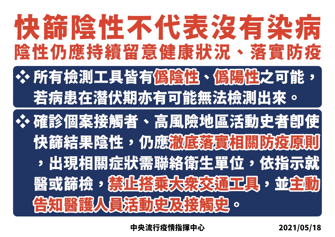 快速抗原快篩是檢測病毒蛋白質,只要10至15分鐘可知結果,但快篩陽性並非確診標準,還要做PCR核酸檢測確認,不過只要是快篩陽性,都會認為高度懷疑的病例,會立即安排安排隔離。但快篩陰性不代表未染疫,檢驗陰性者仍應持續留意健康狀況,被戴口罩並且落實手部消毒,若有疑似症狀須聯繫衛生單位,禁止搭乘大眾運輸。