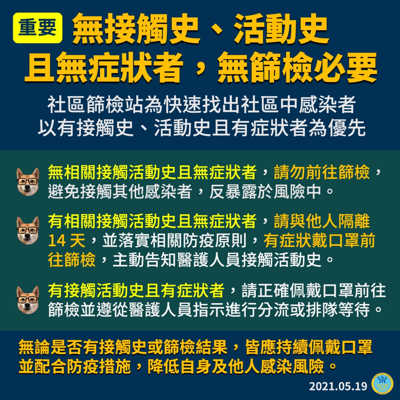 陳時中呼籲,各地篩檢站應以有接觸史、活動史且有症狀者為優先,且為了讓相對高風險者,順利接受採檢,台北市、新北市等兩大重災區也積極擴增篩檢站,桃園市、彰化縣也宣布設置快篩站,設置地點均在高風險區域,陳時中強調,設置篩檢站不是為了讓民眾「沒事來驗驗看」,沒有相關接觸、活動史且無症狀者如果跑到熱點區做快篩,除了浪費資源,還可能增加染疫風險。
