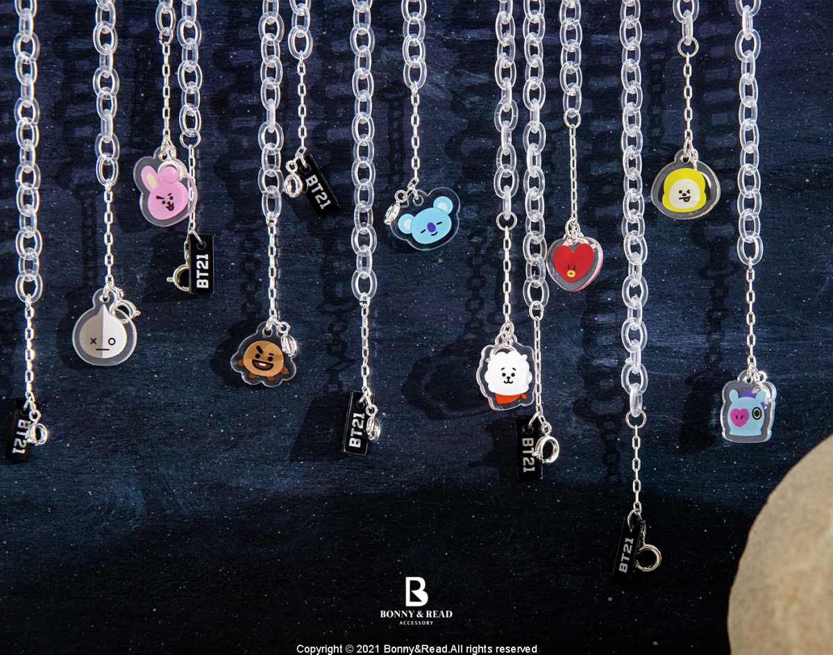 飾品品牌「BONNY & READ」在2021夏末再度找來超人氣的「宇宙明星BT21」推出飾品以及口罩鍊,飾品分為俏皮可愛的彩色版「仰望」以及黑白酷帥以星系作為設計靈感的「星空」兩系列,這次加碼推出的透明鍊帶口罩鍊,更是款款都超可愛。