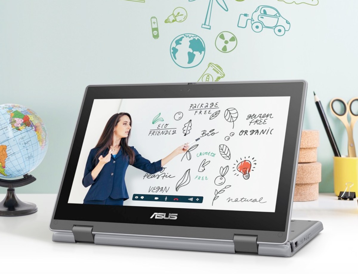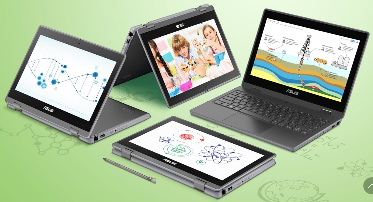 華碩新推的「ASUS BR1100」採360度翻轉觸控11.6吋螢幕,通過TÜV Rheinland認證,可有效過濾藍光。配有「視訊鏡頭」與位於鍵盤區的「實景攝影機」,最高畫素達1300萬,且有「網路攝影機防窺閘」與內建觸控筆。鍵盤防潑水、四邊與角落特別加上防撞膠條,電池續航力達10小時,最大亮點就是鍵盤、觸控面板、置腕處等地方皆使用ASUS BacGuard抗菌處理,24小時內可抑制99%細菌生長,並能使用酒精棉片或次氯酸水清潔表面。