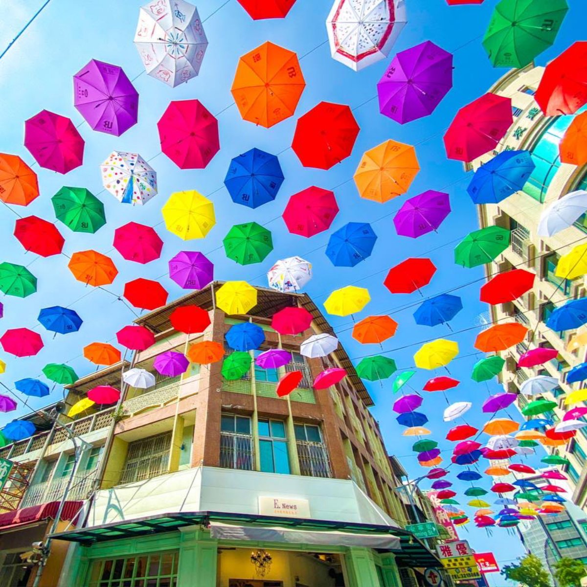 要說到彩虹的城市裝飾,那怎麼能少了後驛商圈的「天空傘」呢!這裡用了各種不同顏色的雨傘把商圈點綴了起來,後驛商圈位於高雄後火車站,有著眾多成衣零售、批發的商場聚落於此,被許多人稱為南部五分埔,為了帶動老舊商圈的發展,特地將街道打造成超美的打卡點呢。