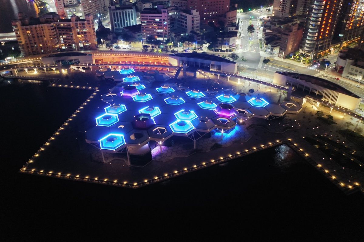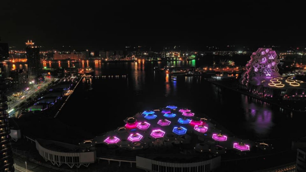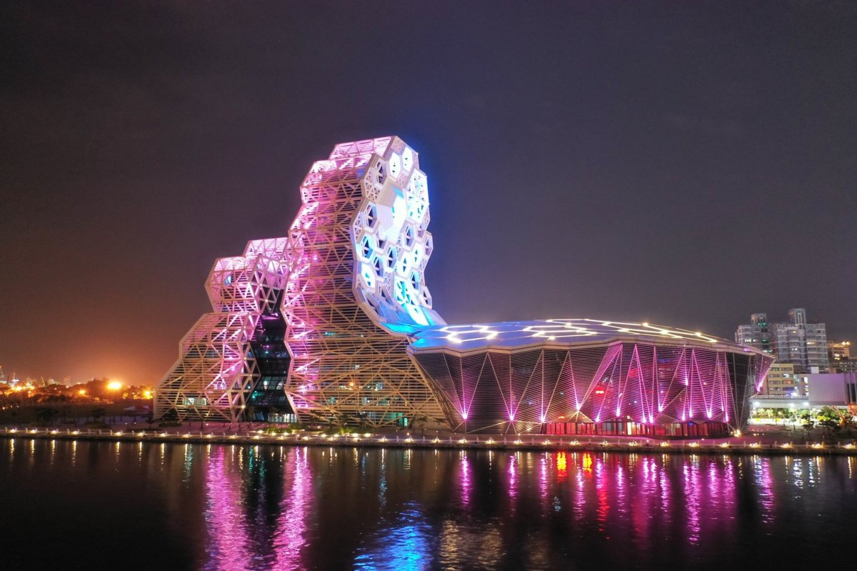 建築設計來自海浪、珊瑚、海豚等概念,夜間景觀照明更呼應了這些海洋元素,看看這座大型建築像不像一隻鯨魚游進了高雄呀~粉紅色系燈光代表著珊瑚,藍色則象徵海洋與海底生物,白天晚上拍起來都不一樣呢,從河岸的另一面看起來真的超級壯觀!